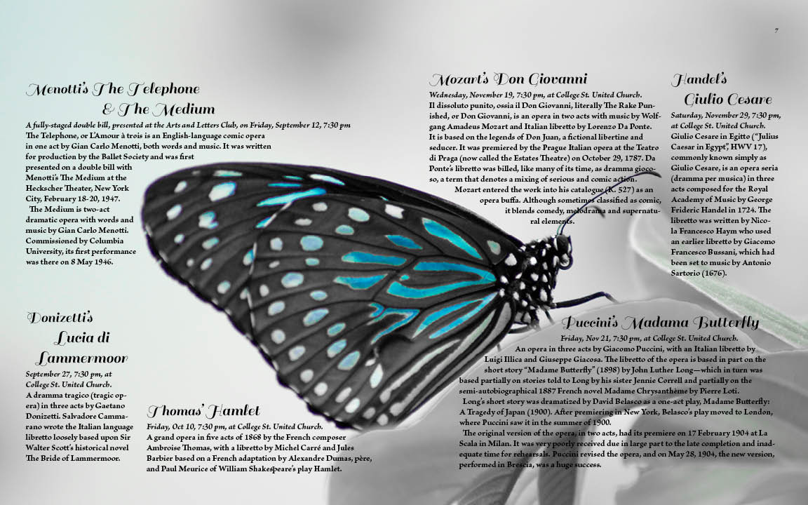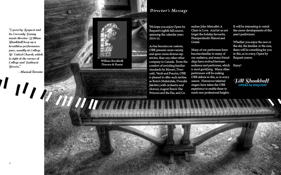 Opera by Request presents Weber’s Der Freischutz, in concert with piano accompaniment, Friday, September 18, 7:30 pm, College St. United Church, 452 College St. (corner of Bathurst). All tickets $20.00. Phone 416 455-2365 for reservations and information.